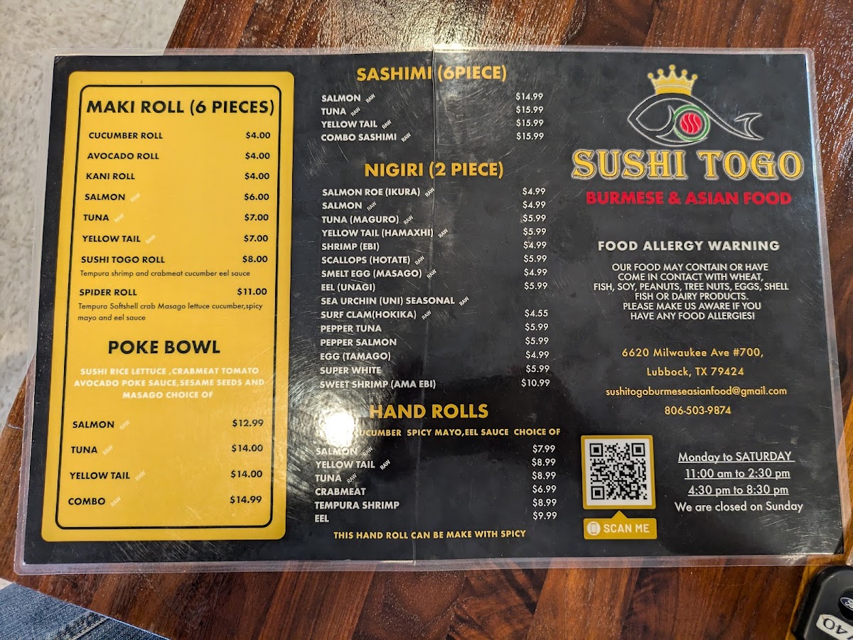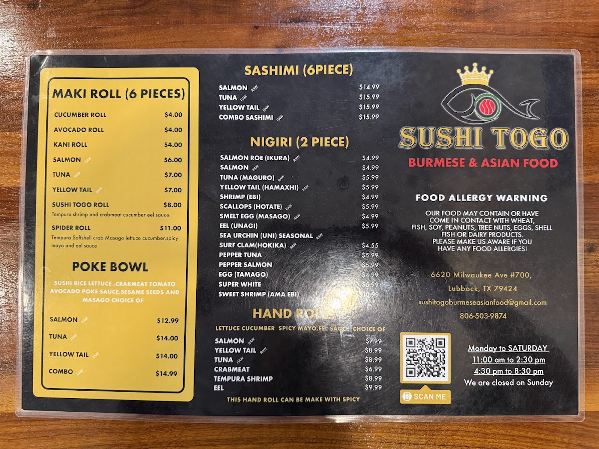 Soybean pockets, sushi rice, salmon, avocado, sushi sauce, spicy mayo, masago, green onions and sesame seeds.